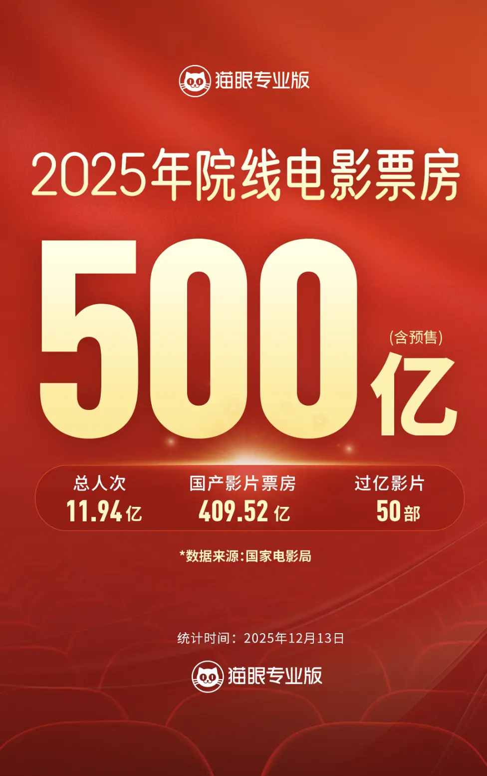 根据国家电影局统计,截至12月13日,2025年中国电影票房已突破500亿元大关,观影人次接近12亿。